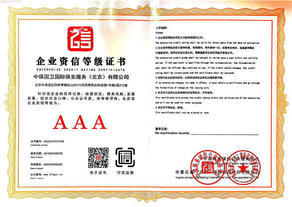 中保國衛(wèi)國際保安服務(wù)(北京)有限公司,屬中保國衛(wèi)集團(tuán)旗下子公司。能全方位的為大型客戶提供優(yōu)質(zhì)的安保、押運(yùn)服務(wù),是集人防和技防于一體的新型正規(guī)化綜合安保押運(yùn)服務(wù)企業(yè),提供人防、物防、技防、聯(lián)網(wǎng)報*、非武裝押運(yùn)等安防相關(guān)的一站式服務(wù)。